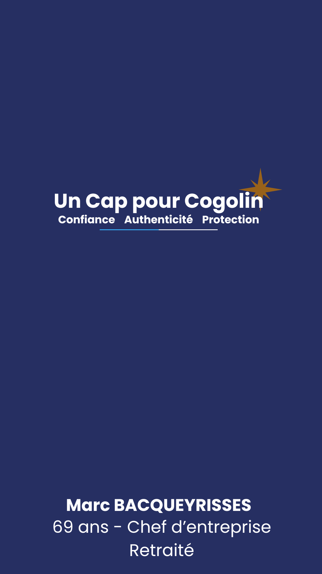 Une équipe de 35 Cogolinoises et Cogolinois rassemblés sous la bannière « Un Cap pour Cogolin », issus de tous nos quartiers et aux profils complémentaires. Des femmes et des hommes engagés dans la vie associative et professionnelle, dans les domaines de la santé, de l’enfance, de la sécurité, de la justice, mais aussi des affaires sociales, du sport, de l’industrie, du commerce, de l’agriculture. Des artisans et des chefs d’entreprise.